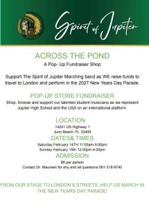 Support the Spirit of Jupiter Marching Band as they raise funds to travel to London and perform in the 2027 New Year’s Day Parade. Across the Pond is a special pop-up fundraiser shop where the community can browse, shop, and support Jupiter High School’s talented student musicians as they represent Jupiter — and the USA — on an international stage.