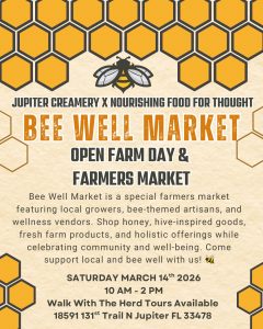 Spend a relaxing Saturday on the farm at the BEE WELL Farmers Market at Jupiter Creamery Farm, happening Saturday, March 14 from 10:00 AM to 2:00 PM in Jupiter Farms, Florida.