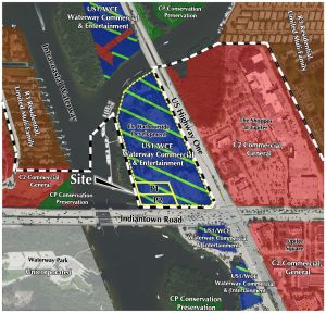 The applicant, represented by Emily O’Mahoney of Urban Design Studio (TGHO), explained that the rezoning is the first of several applications planned to incorporate the parcels into the existing Harbourside Place Planned Unit Development (PUD).